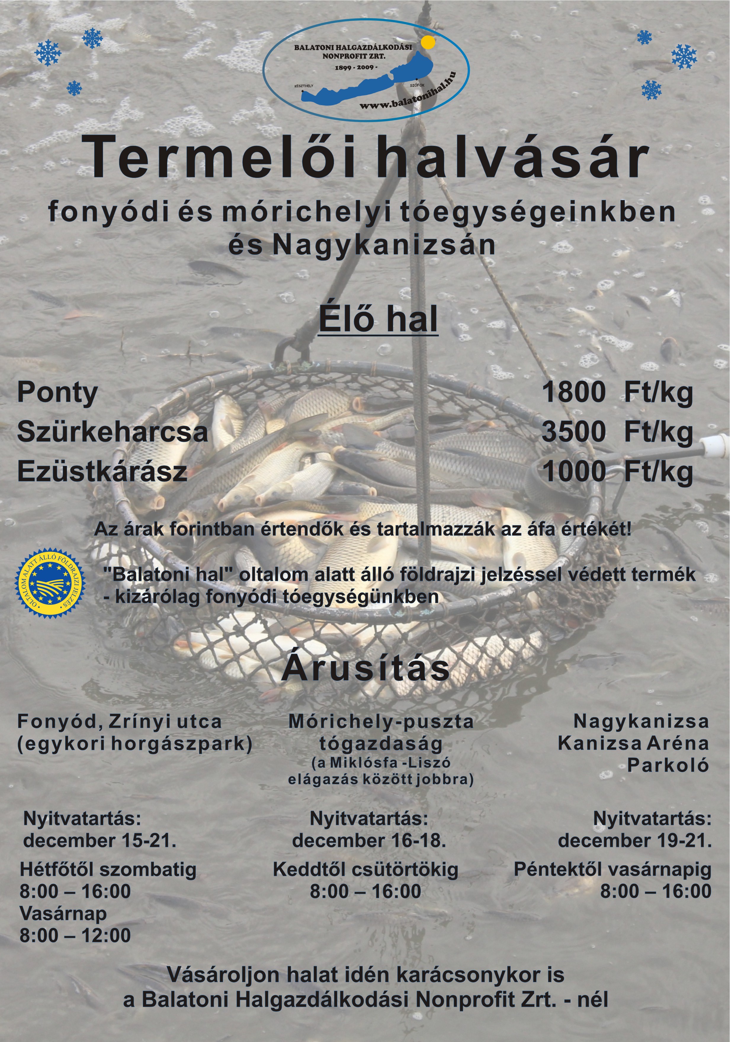 Fonyódon, a Zrínyi utcában (az egykori horgászpark területén) december 15. és 21. között zajlik az értékesítés. Hétfőtől szombatig 8-tól 16 óráig, vasárnap pedig 8-tól délig lehet halat venni.