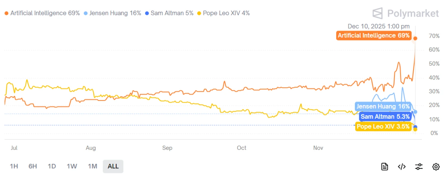 Mi történt? A Polymarket előrejelzési piac állása szerint a befektetők azt tartják a legvalószínűbb forgatókönyvnek, hogy 2025-ben a Time Magazin a mesterséges intelligenciát választja az év emberévé. Az MI győzelmére már több mint 3,5 millió dollár (1,15 milliárd forint) értékben fogadtak a befektetők, a siker valószínűsége jelenleg 69 százalékon áll. A piac egyéb legnépszerűbb nevei Huang Zsen-hszün Nvidia-vezér (14 százalék), Sam Altman (6 százalék), és XIV. Leó pápa (3 százalék), de amint a százalékokból is látszik, a befektetők az ő sikerüket jóval valószínűtlenebbnek látják.